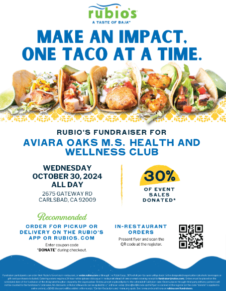 Support the Health & Wellness Club (aka. PE Classes) with a dine out night at Rubio's in Bressi Ranch on Wednesday, October 30th. Please show the flyer below and 30% of the sales will come back to AOM!